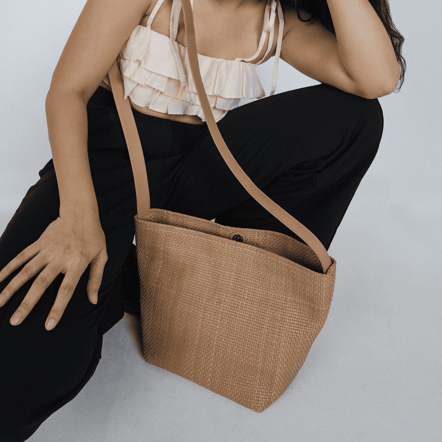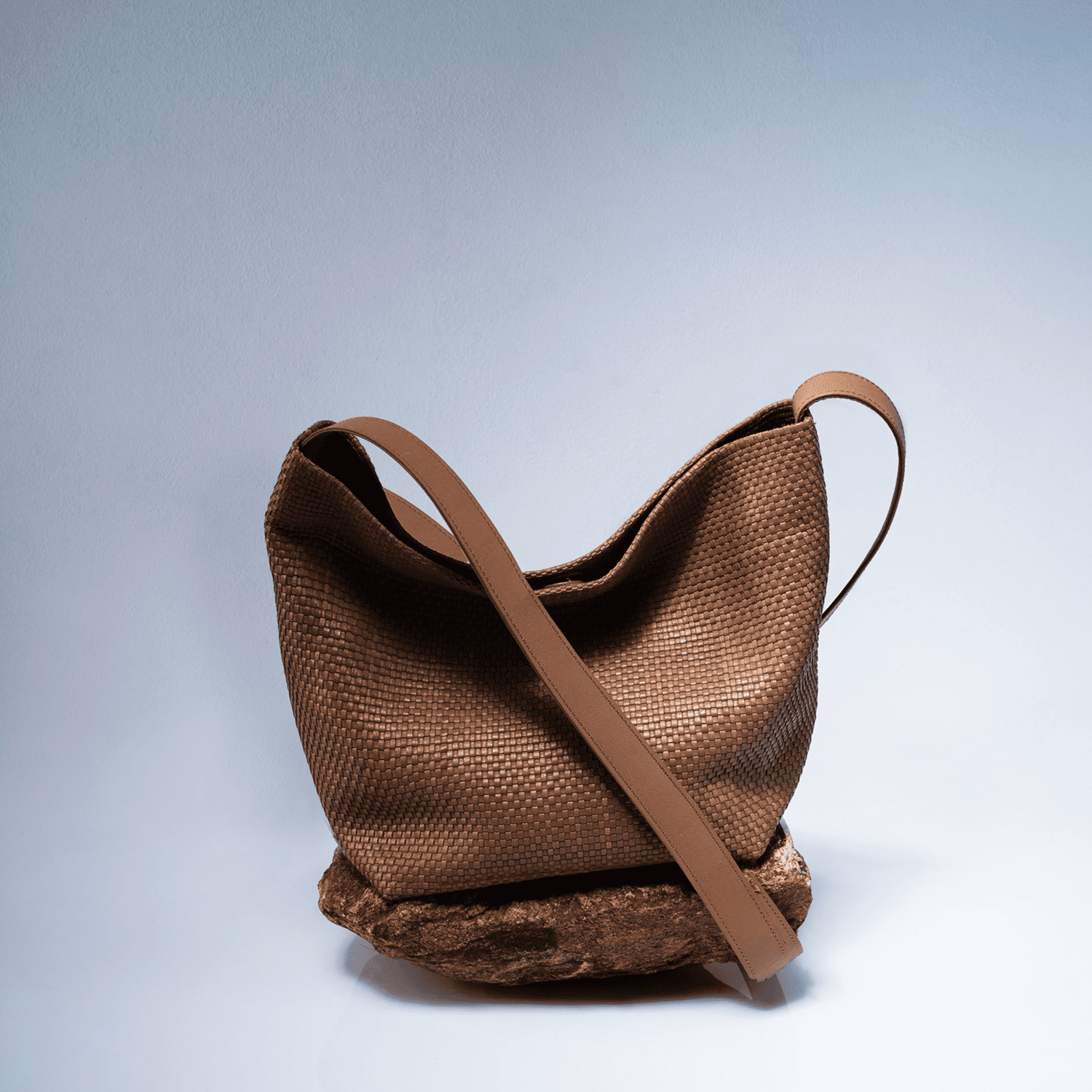 The Phobos M in Smoke brings a warm, earthy sophistication to the classic shoulder silhouette. Its fluid form and tactile weave make it an everyday favorite.