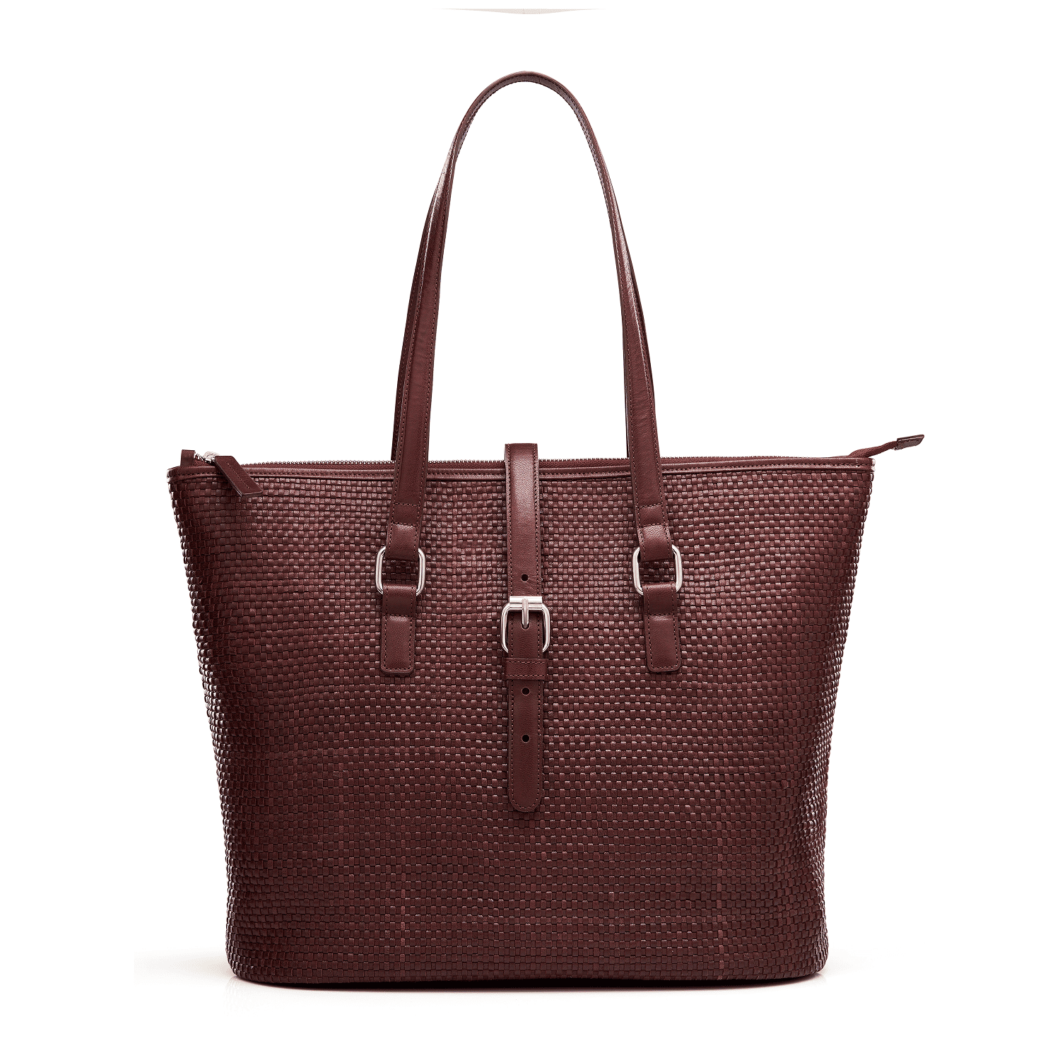 Spacious tote bag with cotton lining and metal zipper closure. Includes one zipper pocket and one open pocket for everyday essentials