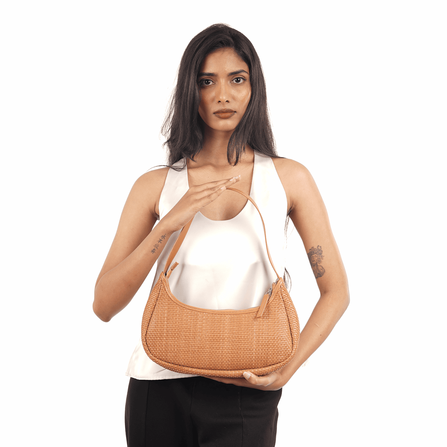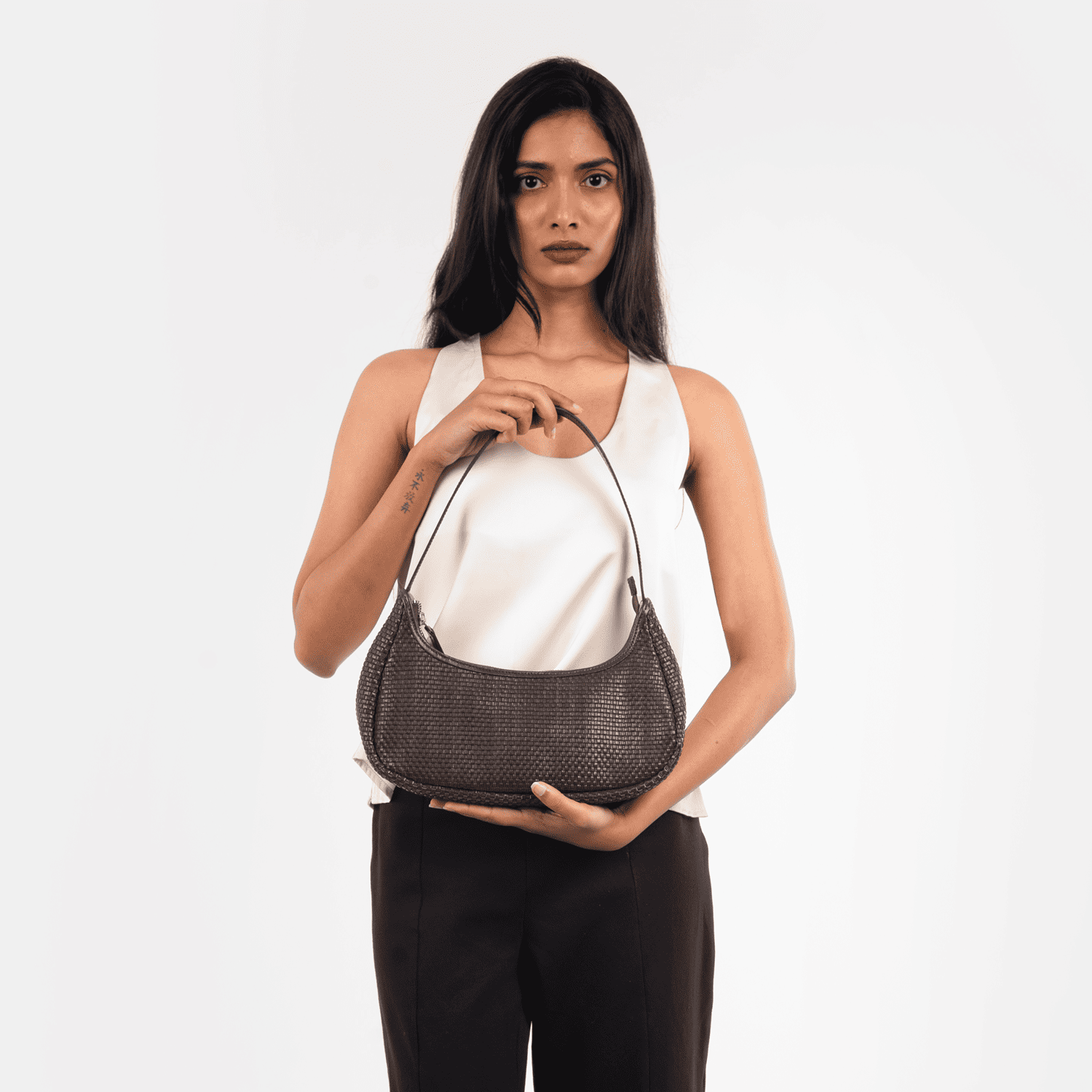 Chic and sculpted, the Vienna S embodies understated glamour. Its curved silhouette and detailed handwoven finish exude quiet luxury for any occasion.